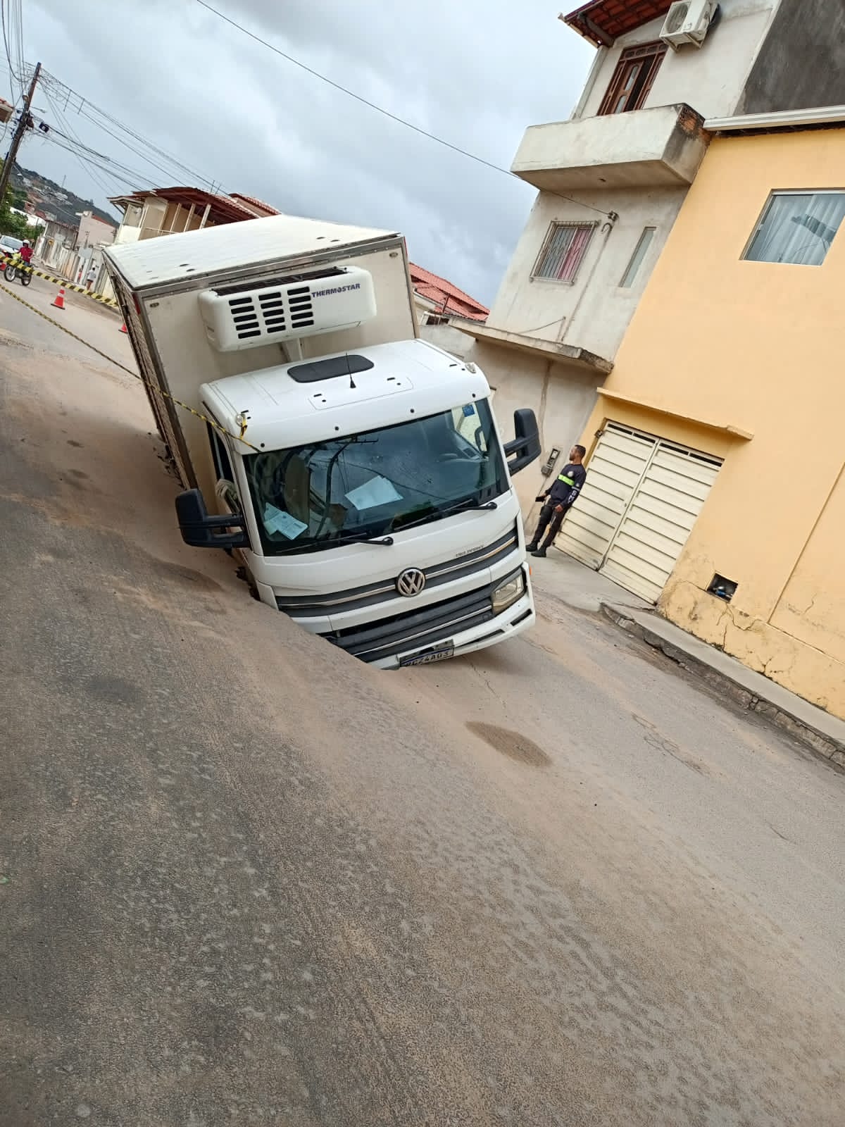 Na tarde desta quinta-feira (23), um caminhão-baú afundou após o calçamento ceder nas imediações da Escola Letícia Teixeira, no bairro Mundo Novo, em Jacobina.